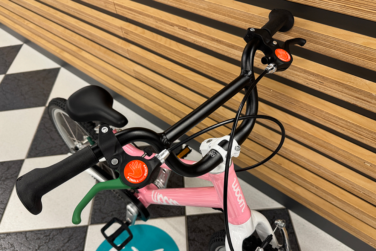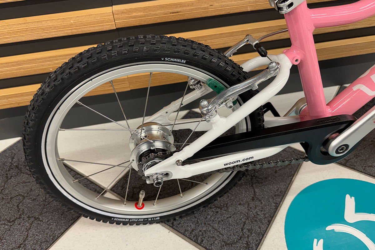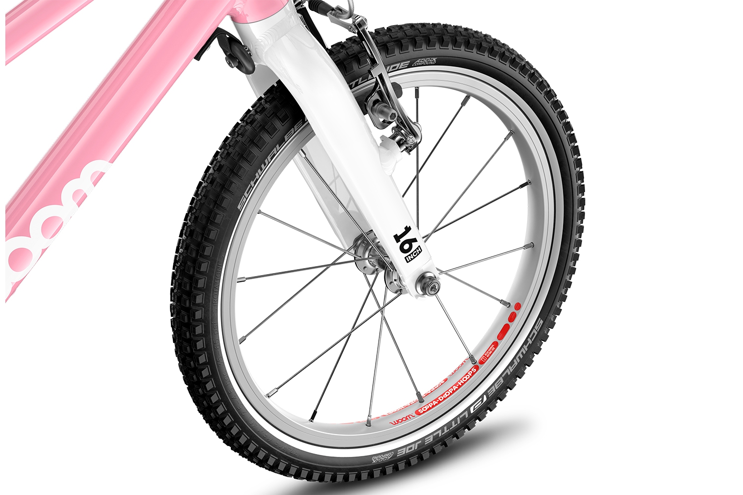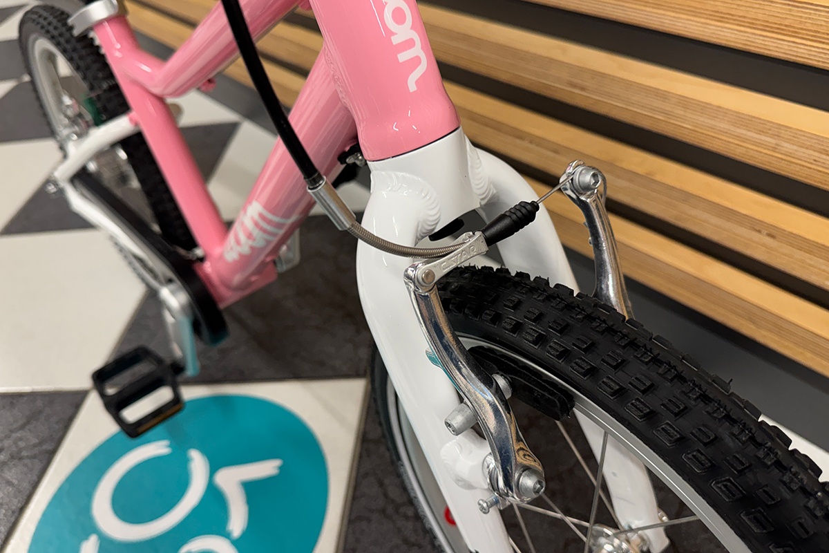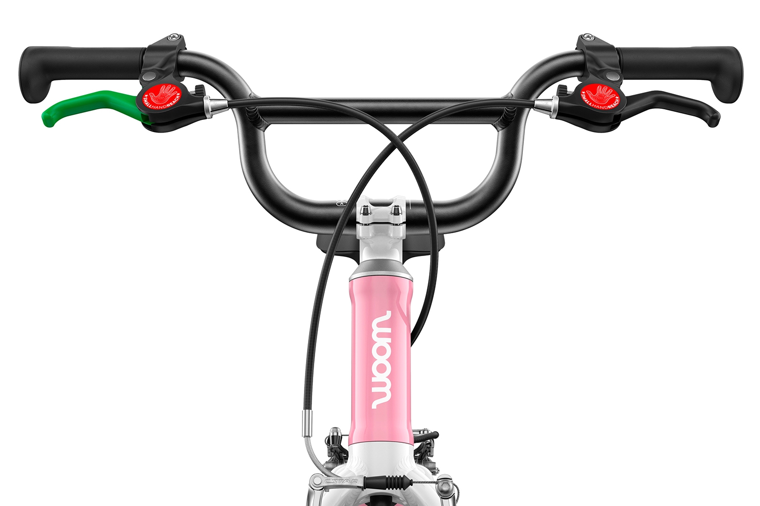 W rowerze dziecięcym woom 3 GO zastosowano tradycyjne hamulce V-Brake, które są nie tylko bardziej praktyczne niż tzw 'kontra', ale także dzieci uczą się już używać hamulców, które będą im towarzyszyć przez całe życie. Klocki hamulcowe wykończone miękką okładziną zapewniają dużą i skuteczną siłę hamowania przy niedużej sile nacisku klamki hamulca. Jeśli już mowa o klamkach hamulcowych, to woom postanowił wspomóc dzieci na początku ich przygody i oznaczyć która klamka hamulcowa odpowiada za który hamulec – zielona klamka i zielone klocki hamulcowe to tylny hamulec; czarna klamka i czarne klocki to przedni hamulec. Takie rozwiązanie jest bardzo pomocne i pomaga dziecku rozróżnić hamulce, aby zapobiec przypadkowej pomyłce. Ponadto dźwignie hamulca są specjalnie 'pomniejszone' aby dopasować się do dziecięcych rączek. 16 calowe koła zostały wyposażone w aluminiowe obręcze oraz wysokiej klasy niemieckie opony Schwalbe o niskich oporach toczenia, co zapewnia bardzo komfortową i przyjemną jazdę. Ponadto opony posiadają odblaskowy pasek, który zwiększa bezpieczeństwo i widoczność rowerzysty po zmroku.