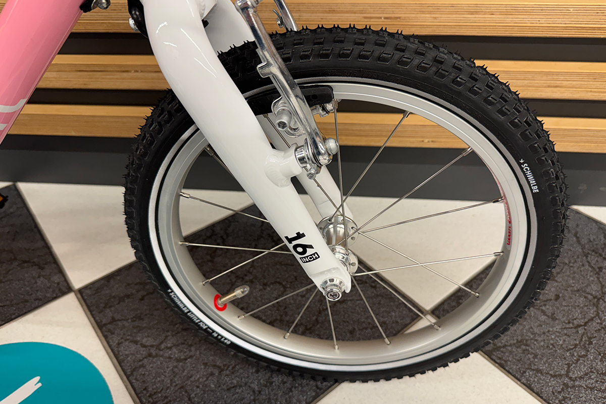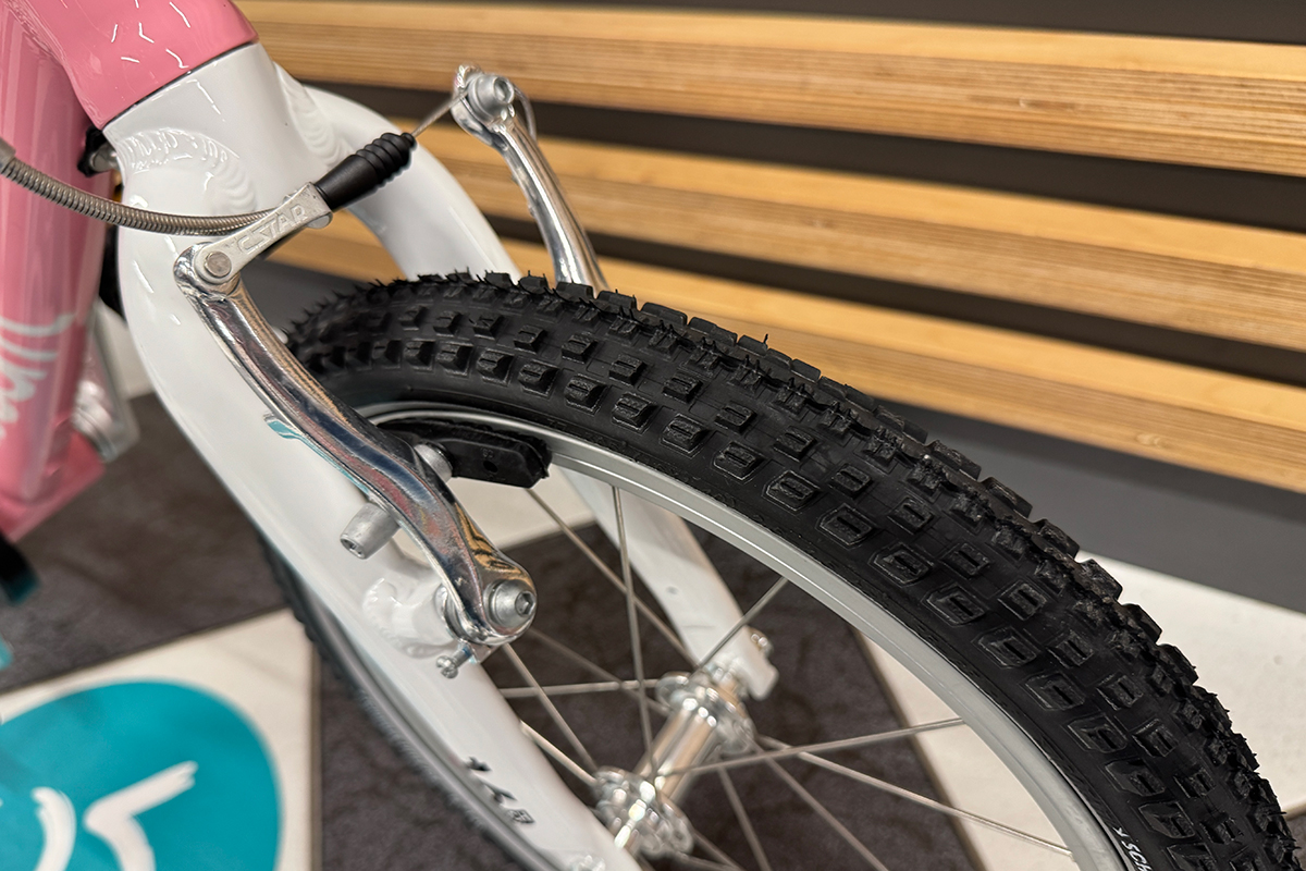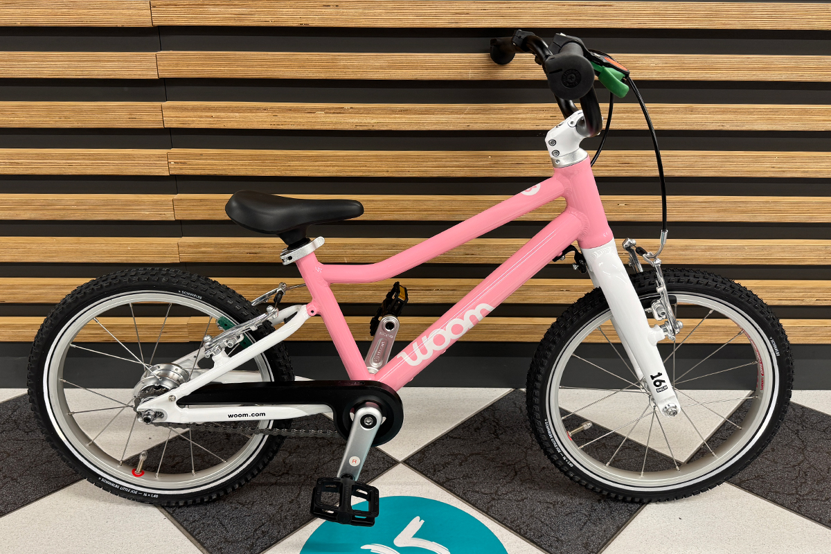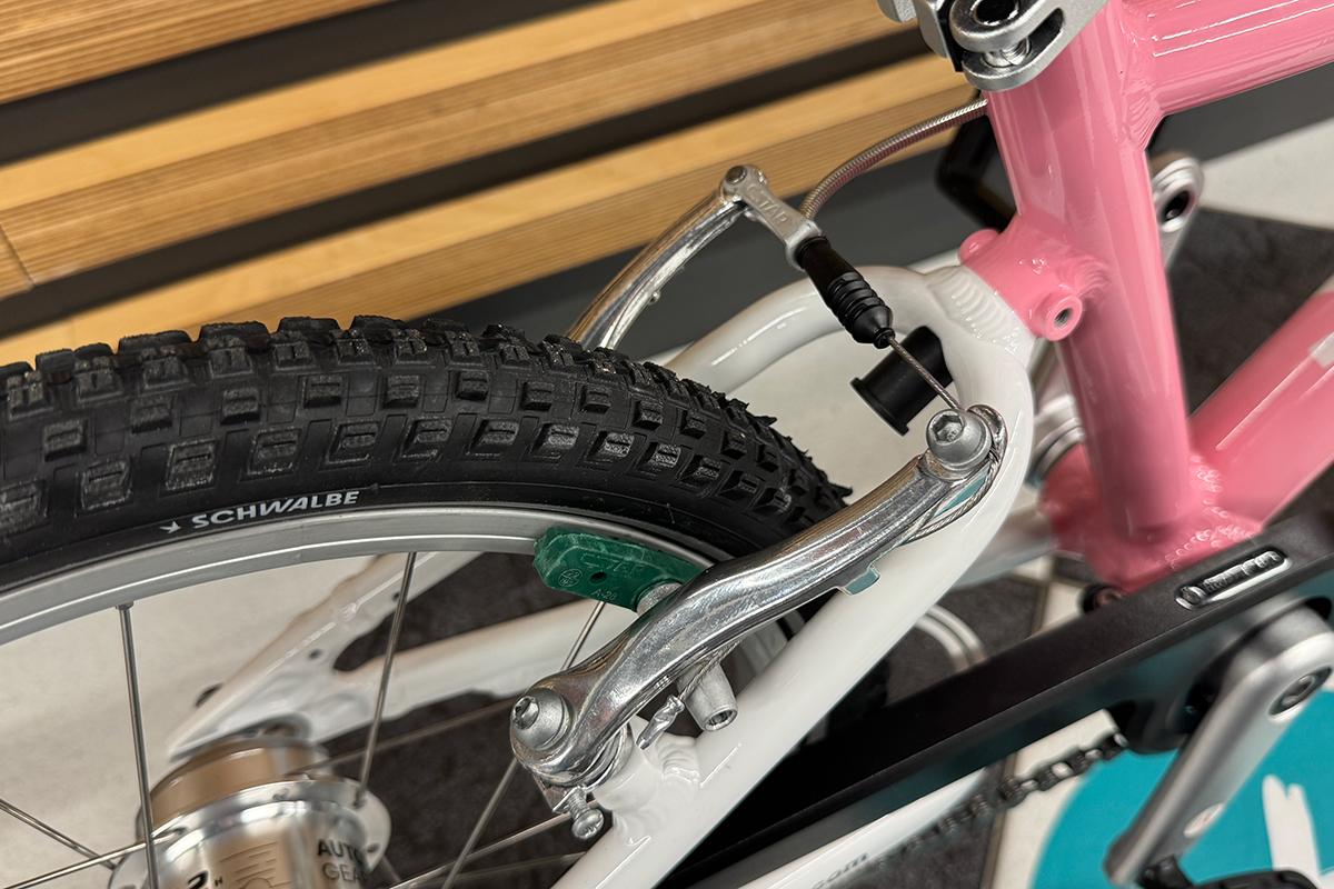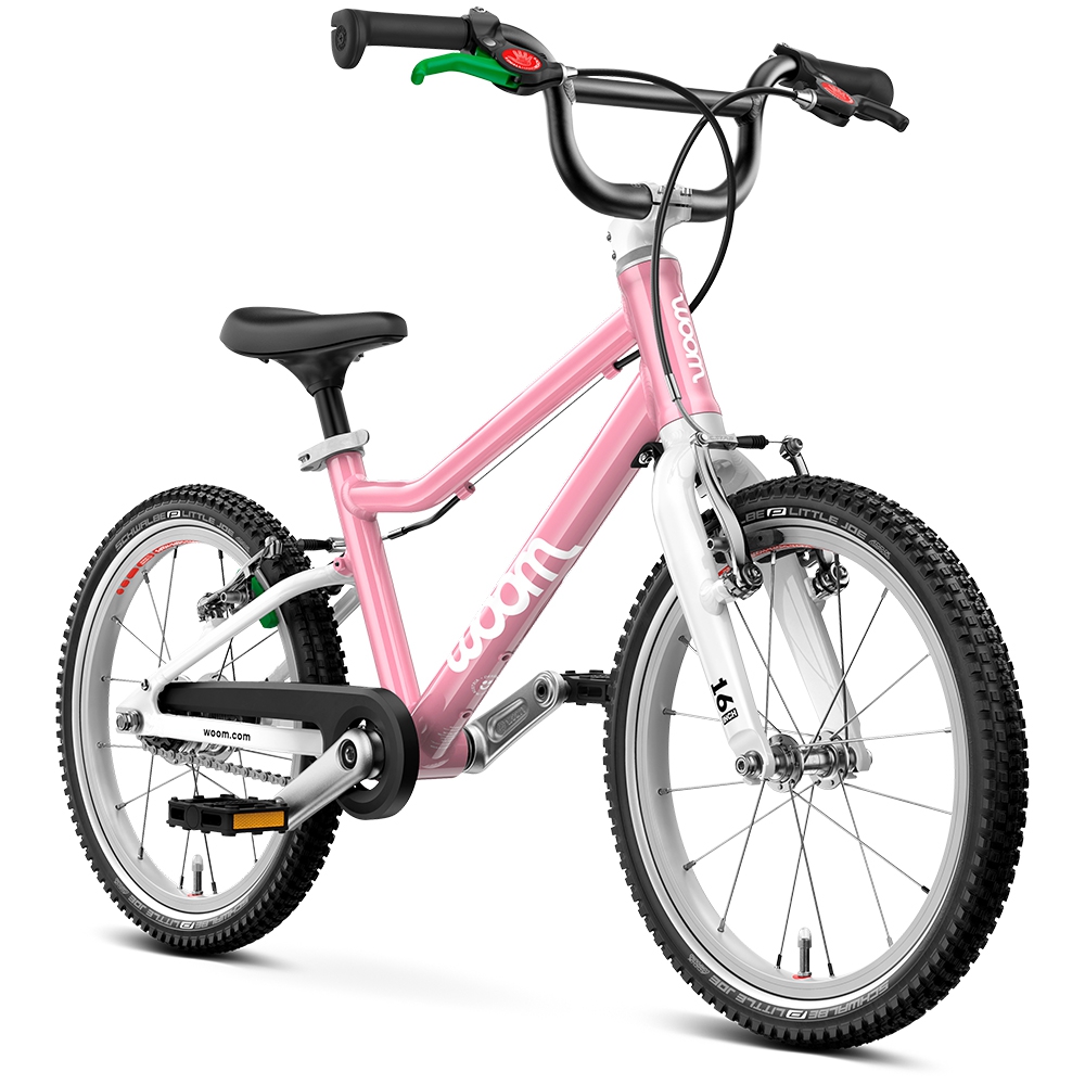 W rowerze dziecięcym woom 3 GO zastosowano tradycyjne hamulce V-Brake, które są nie tylko bardziej praktyczne niż tzw 'kontra', ale także dzieci uczą się już używać hamulców, które będą im towarzyszyć przez całe życie. Klocki hamulcowe wykończone miękką okładziną zapewniają dużą i skuteczną siłę hamowania przy niedużej sile nacisku klamki hamulca. Jeśli już mowa o klamkach hamulcowych, to woom postanowił wspomóc dzieci na początku ich przygody i oznaczyć która klamka hamulcowa odpowiada za który hamulec – zielona klamka i zielone klocki hamulcowe to tylny hamulec; czarna klamka i czarne klocki to przedni hamulec. Takie rozwiązanie jest bardzo pomocne i pomaga dziecku rozróżnić hamulce, aby zapobiec przypadkowej pomyłce. Ponadto dźwignie hamulca są specjalnie 'pomniejszone' aby dopasować się do dziecięcych rączek. 16 calowe koła zostały wyposażone w aluminiowe obręcze oraz wysokiej klasy niemieckie opony Schwalbe o niskich oporach toczenia, co zapewnia bardzo komfortową i przyjemną jazdę. Ponadto opony posiadają odblaskowy pasek, który zwiększa bezpieczeństwo i widoczność rowerzysty po zmroku.