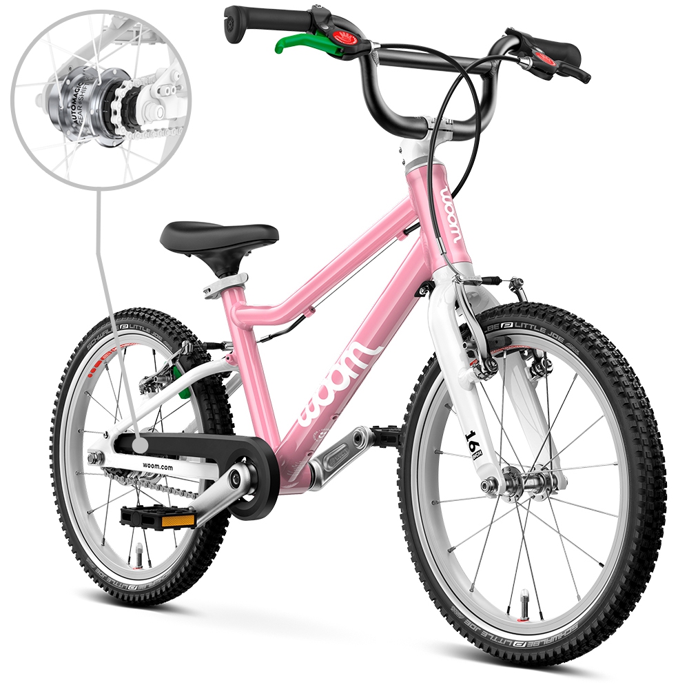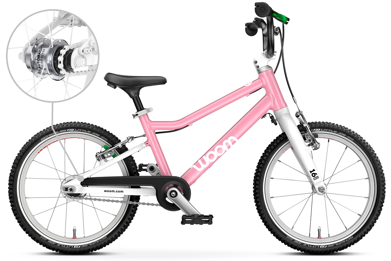 Oto całkowita rewolucja wśród dziecięcych rowerów o 16 calowych kołach. Rower dla dzieci woom GO 3 AUTOMAGIC umożliwia łatwiejsze podjazdy pod wzniesienia oraz lepszą kontrolę tempa maluchom dzięki innowacyjnej, dwubiegowej przerzutce w piaście Sturmey-Archer Automatic. Przerzutka jest bezobsługowa i samoistnie zmienia się na wyższy bieg przy osiągnięciu prędkości ok. 11 km/h. Umożliwia to nie tylko osiąganie nieco większych prędkości, ale także jazdę po bardziej zróżnicowanym terenie. Takie rozwiązanie daje podwójną frajdę dziecku gdyż może pokonać znacznie większe dystanse przy mniejszym zmęczeniu, a także rodzicom dając możliwość wspólnych, dłuższych rodzinnych wypraw rowerowych ze swoimi pociechami.