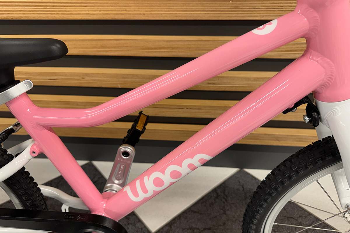 Rower dziecięcy woom 3 GO AUTOMAGIC na 16" kołach posiada ramę wykonaną w całości z bardzo lekkiego stopu aluminium 6061, dzięki czemu waga całego roweru wynosi tylko 6,2 kg! Rozmiar ramy jest dostosowany dla dzieci w wieku od około 4 do 6 lat, a kierując się wzrostem – od około 105 cm. Minimalna wysokość siodełka wynosi 48 cm natomiast maksymalna to 64 cm. Nisko poprowadzona rama ułatwia wsiadanie i zsiadanie z rowerka, co jest szczególnie istotne podczas nauki jazdy. O tym jak odpowiednio dobrać rozmiar roweru dla swojej pociechy piszemy w naszym poradniku "Jak dobrze wybrać rower dla dziecka", zachęcamy do lektury przed zakupem. Aluminiowy widelec skierowany jest mocno do przodu, co zwiększa kontrolę nad rowerem, a jest to bardzo istotne podczas nauki jazdy na rowerze oraz w szlifowaniu tej umiejętności. Rower występuje w kilku wariantach kolorystycznych, z których każdy maluch na pewno wybierze któryś dla siebie.