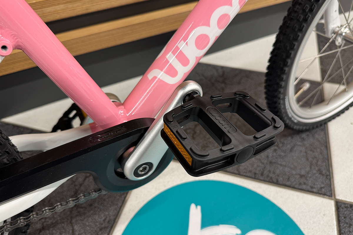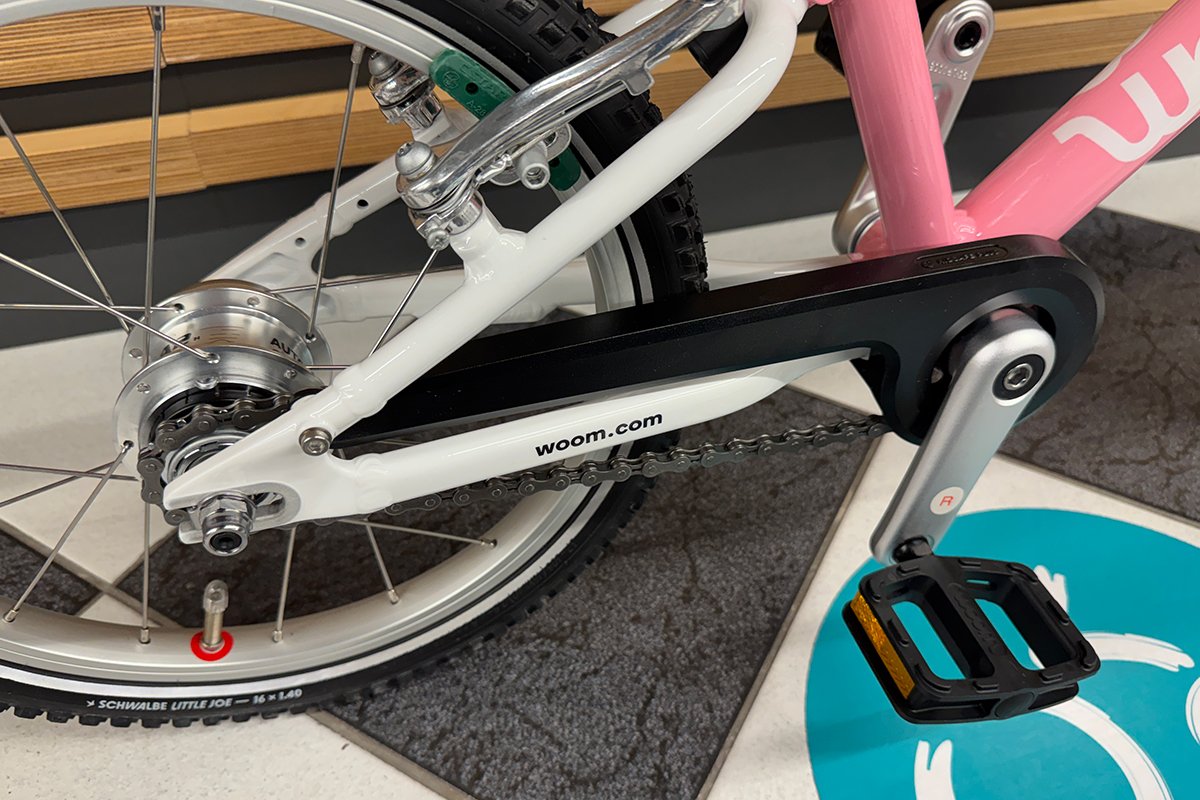 Napęd rowerka dziecięcego woom 3 GO AUTOMAGIC to coraz powszechniej montowany w rowerach dziecięcych wolnobieg. Przełożenia 18 zębów z przodu oraz 12 z tyłu nie jest przypadkowe i specjalnie jest dobrane aby wspomagać naukę jazdy oraz doskonalenie tej umiejętności. Ramiona pedałów o długości 95 mm oraz rozstawie dopasowanym do dziecięcej anatomii zwiększają komfort użytkowania oraz ułatwiają naukę jazdy. Ponadto dzięki wolnobiegowi dziecko bez problemu ustawi pedałka do wygodnej pozycji startowej. Ponadto ogromną zaletą wolnobiegu jest niewątpliwie brak konsekwencji przy pomyłce pedałowania do tyłu. Szczelna zabudowa napędu zapobiega wciągnięciu lub pobrudzeniu nogawki przez łańcuch oraz zabezpiecza napęd przed zabrudzeniami.
