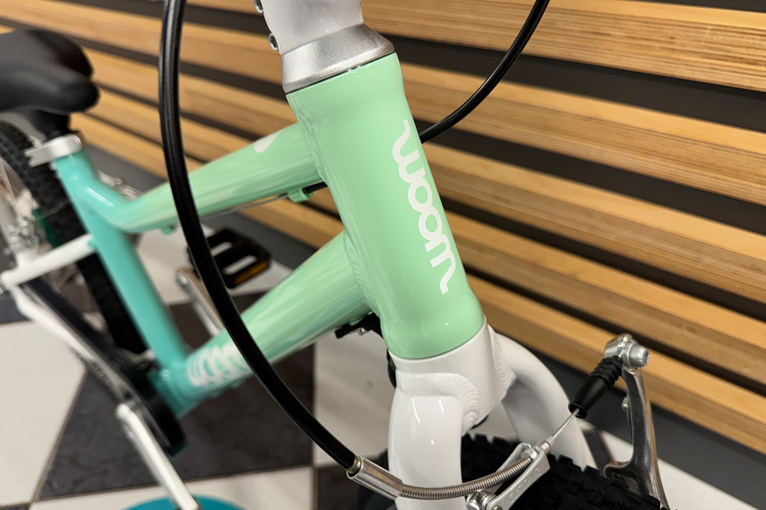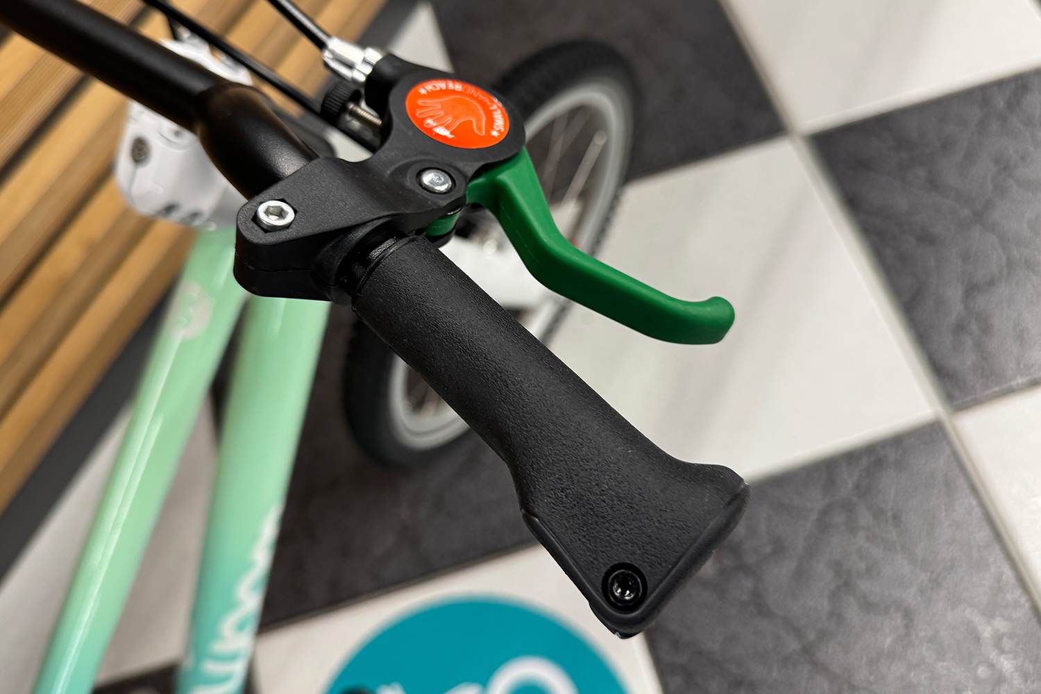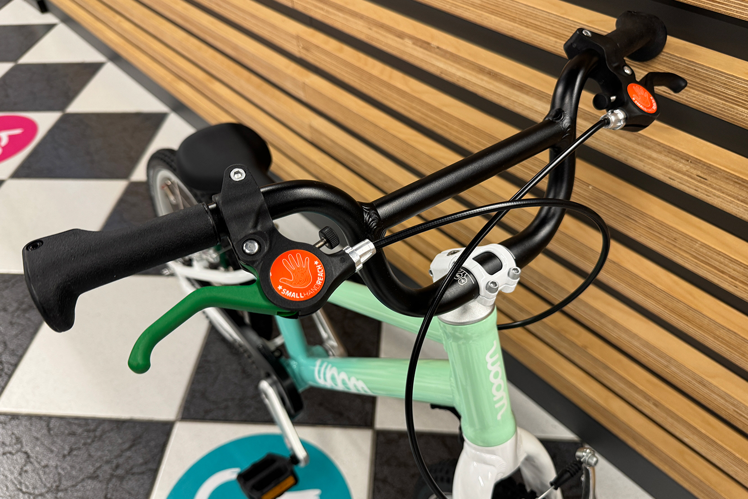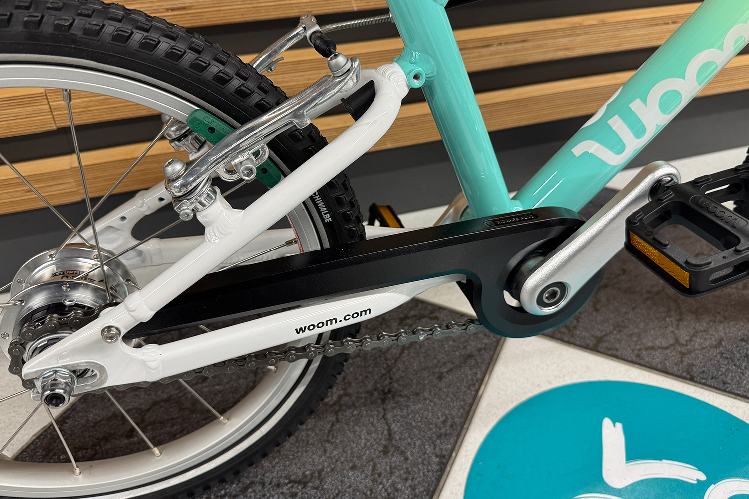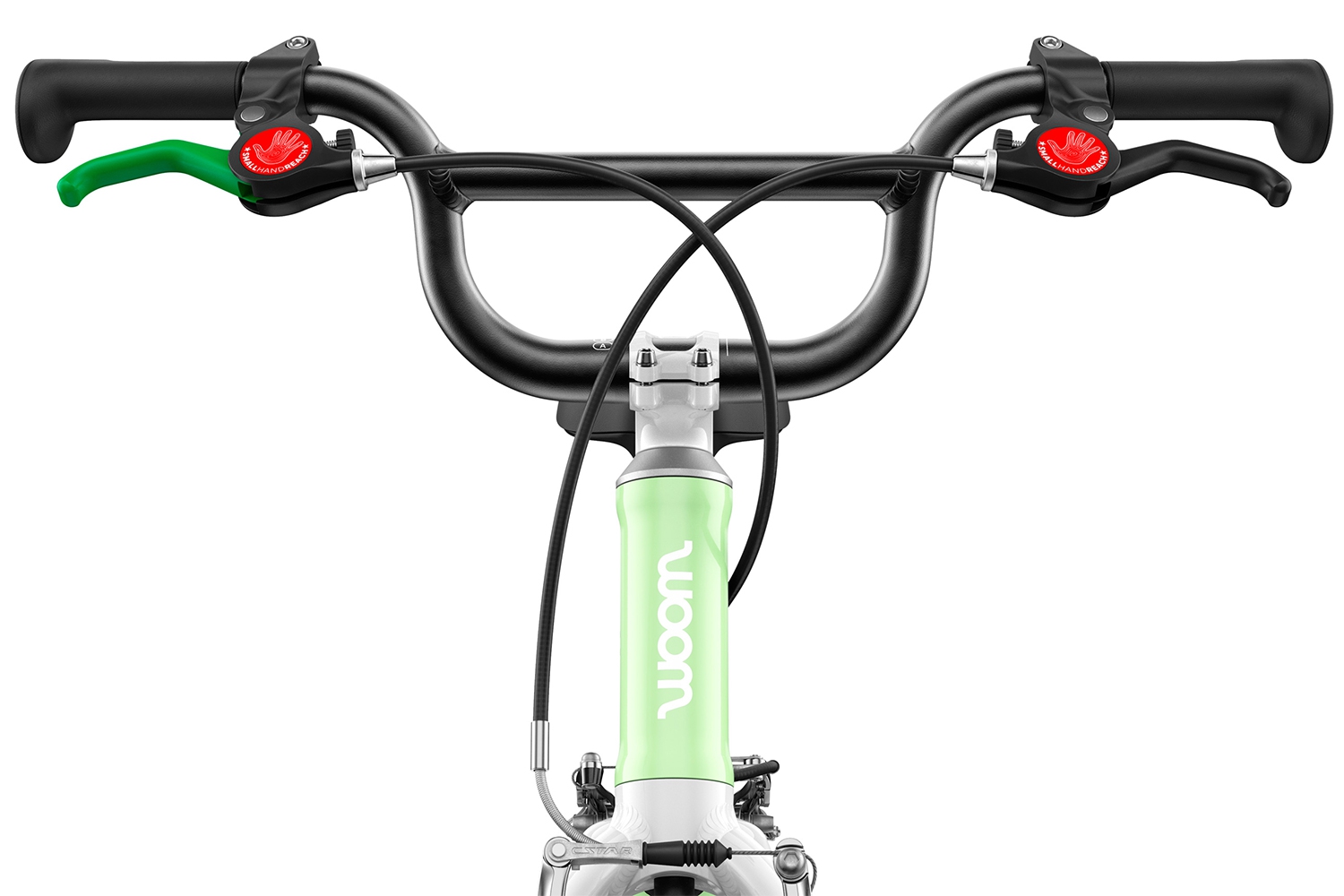 W rowerze dziecięcym woom 3 GO zastosowano tradycyjne hamulce V-Brake, które są nie tylko bardziej praktyczne niż tzw 'kontra', ale także dzieci uczą się już używać hamulców, które będą im towarzyszyć przez całe życie. Klocki hamulcowe wykończone miękką okładziną zapewniają dużą i skuteczną siłę hamowania przy niedużej sile nacisku klamki hamulca. Jeśli już mowa o klamkach hamulcowych, to woom postanowił wspomóc dzieci na początku ich przygody i oznaczyć która klamka hamulcowa odpowiada za który hamulec – zielona klamka i zielone klocki hamulcowe to tylny hamulec; czarna klamka i czarne klocki to przedni hamulec. Takie rozwiązanie jest bardzo pomocne i pomaga dziecku rozróżnić hamulce, aby zapobiec przypadkowej pomyłce. Ponadto dźwignie hamulca są specjalnie 'pomniejszone' aby dopasować się do dziecięcych rączek. 16 calowe koła zostały wyposażone w aluminiowe obręcze oraz wysokiej klasy niemieckie opony Schwalbe o niskich oporach toczenia, co zapewnia bardzo komfortową i przyjemną jazdę. Ponadto opony posiadają odblaskowy pasek, który zwiększa bezpieczeństwo i widoczność rowerzysty po zmroku.