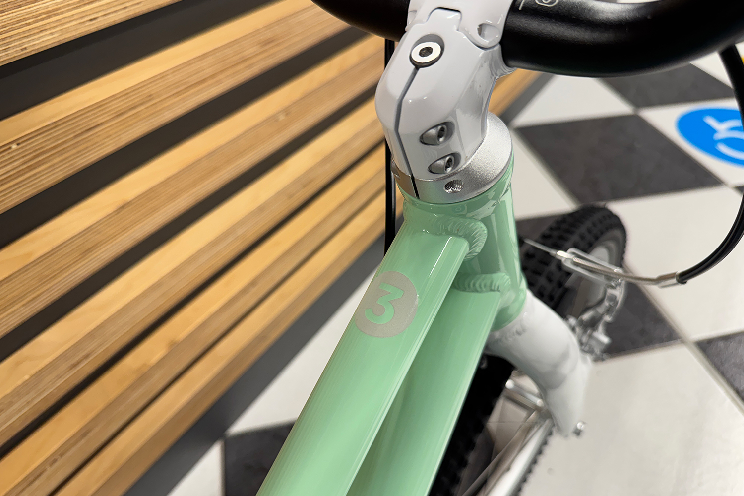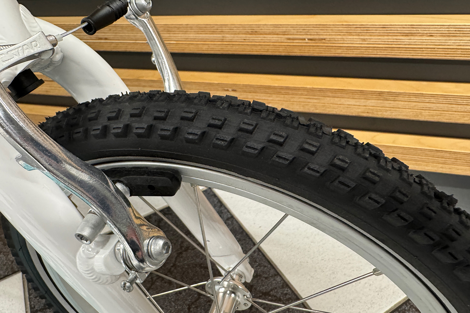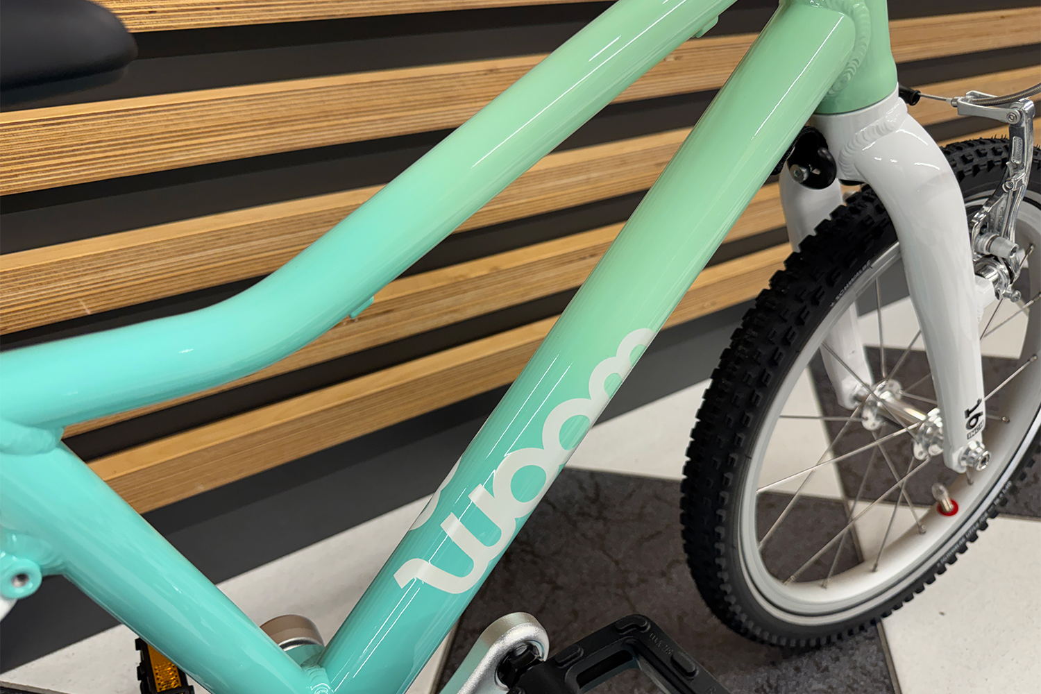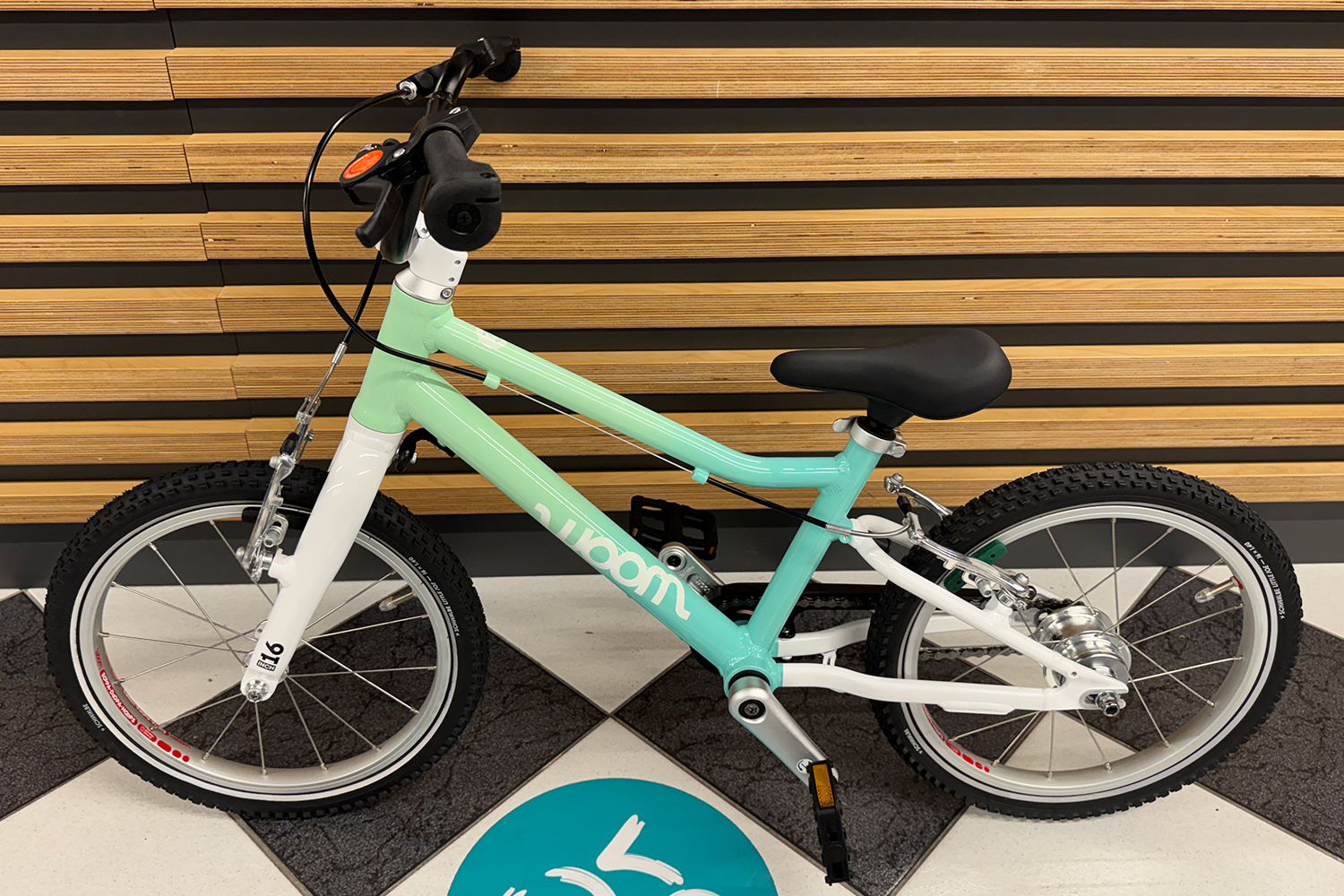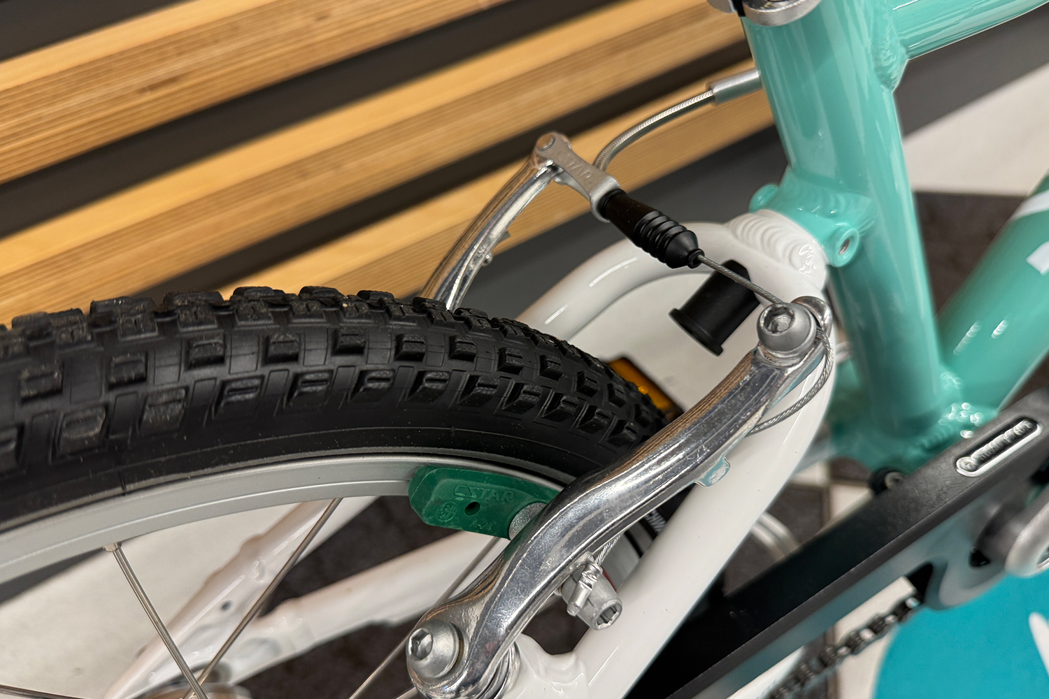 W rowerze dziecięcym woom 3 GO zastosowano tradycyjne hamulce V-Brake, które są nie tylko bardziej praktyczne niż tzw 'kontra', ale także dzieci uczą się już używać hamulców, które będą im towarzyszyć przez całe życie. Klocki hamulcowe wykończone miękką okładziną zapewniają dużą i skuteczną siłę hamowania przy niedużej sile nacisku klamki hamulca. Jeśli już mowa o klamkach hamulcowych, to woom postanowił wspomóc dzieci na początku ich przygody i oznaczyć która klamka hamulcowa odpowiada za który hamulec – zielona klamka i zielone klocki hamulcowe to tylny hamulec; czarna klamka i czarne klocki to przedni hamulec. Takie rozwiązanie jest bardzo pomocne i pomaga dziecku rozróżnić hamulce, aby zapobiec przypadkowej pomyłce. Ponadto dźwignie hamulca są specjalnie 'pomniejszone' aby dopasować się do dziecięcych rączek. 16 calowe koła zostały wyposażone w aluminiowe obręcze oraz wysokiej klasy niemieckie opony Schwalbe o niskich oporach toczenia, co zapewnia bardzo komfortową i przyjemną jazdę. Ponadto opony posiadają odblaskowy pasek, który zwiększa bezpieczeństwo i widoczność rowerzysty po zmroku.