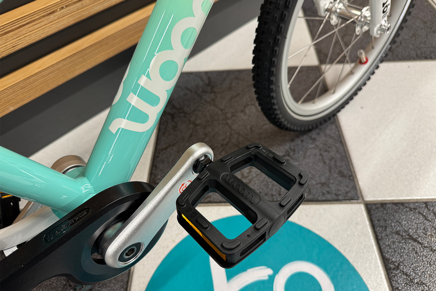 Napęd rowerka dziecięcego woom 3 GO AUTOMAGIC to coraz powszechniej montowany w rowerach dziecięcych wolnobieg. Przełożenia 18 zębów z przodu oraz 12 z tyłu nie jest przypadkowe i specjalnie jest dobrane aby wspomagać naukę jazdy oraz doskonalenie tej umiejętności. Ramiona pedałów o długości 95 mm oraz rozstawie dopasowanym do dziecięcej anatomii zwiększają komfort użytkowania oraz ułatwiają naukę jazdy. Ponadto dzięki wolnobiegowi dziecko bez problemu ustawi pedałka do wygodnej pozycji startowej. Ponadto ogromną zaletą wolnobiegu jest niewątpliwie brak konsekwencji przy pomyłce pedałowania do tyłu. Szczelna zabudowa napędu zapobiega wciągnięciu lub pobrudzeniu nogawki przez łańcuch oraz zabezpiecza napęd przed zabrudzeniami.