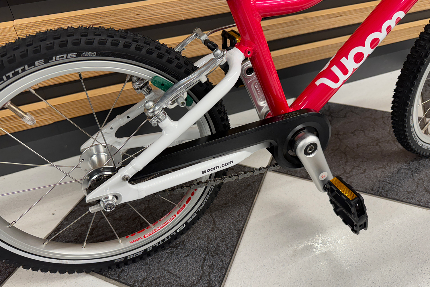 Napęd rowerka dziecięcego woom 3 GO to coraz powszechniej montowany w rowerach dziecięcych wolnobieg. Przełożenia 18 zębów z przodu oraz 10 z tyłu nie jest przypadkowe i specjalnie jest dobrane aby wspomagać naukę jazdy oraz doskonalenie tej umiejętności. Ramiona pedałów o długości 95 mm oraz rozstawie dopasowanym do dziecięcej anatomii zwiększają komfort użytkowania oraz ułatwiają naukę jazdy. Ponadto dzięki wolnobiegowi dziecko bez problemu ustawi pedałki do wygodnej pozycji startowej. Ponadto ogromną zaletą wolnobiegu jest niewątpliwie brak konsekwencji przy pomyłce pedałowania do tyłu. Szczelna zabudowa napędu zapobiega wciągnięciu lub pobrudzeniu nogawki przez łańcuch oraz zabezpiecza napęd przed zabrudzeniami. 16 calowe koła zostały wyposażone w aluminiowe obręcze oraz wysokiej klasy niemieckie opony Schwalbe o niskich oporach toczenia, co zapewnia bardzo komfortową i przyjemną jazdę. Ponadto opony posiadają odblaskowy pasek, który zwiększa bezpieczeństwo i widoczność rowerzysty po zmroku.