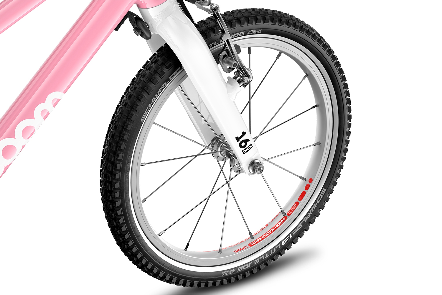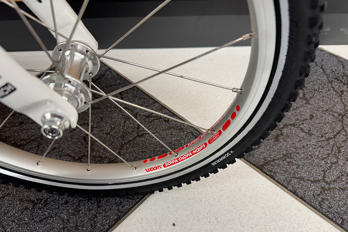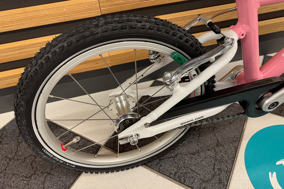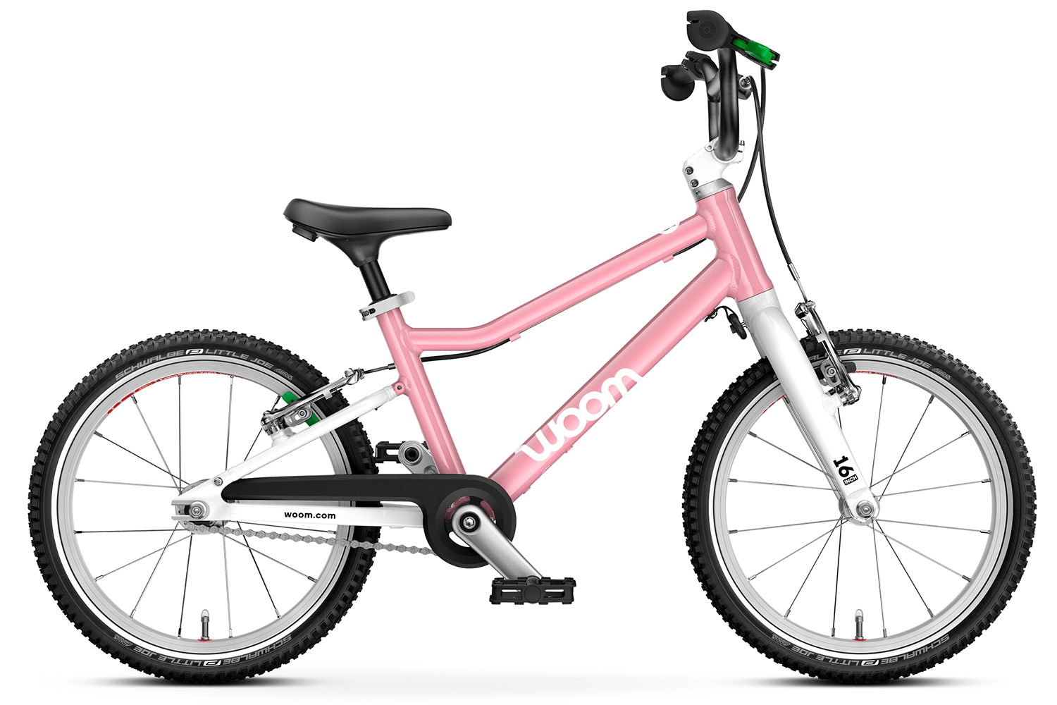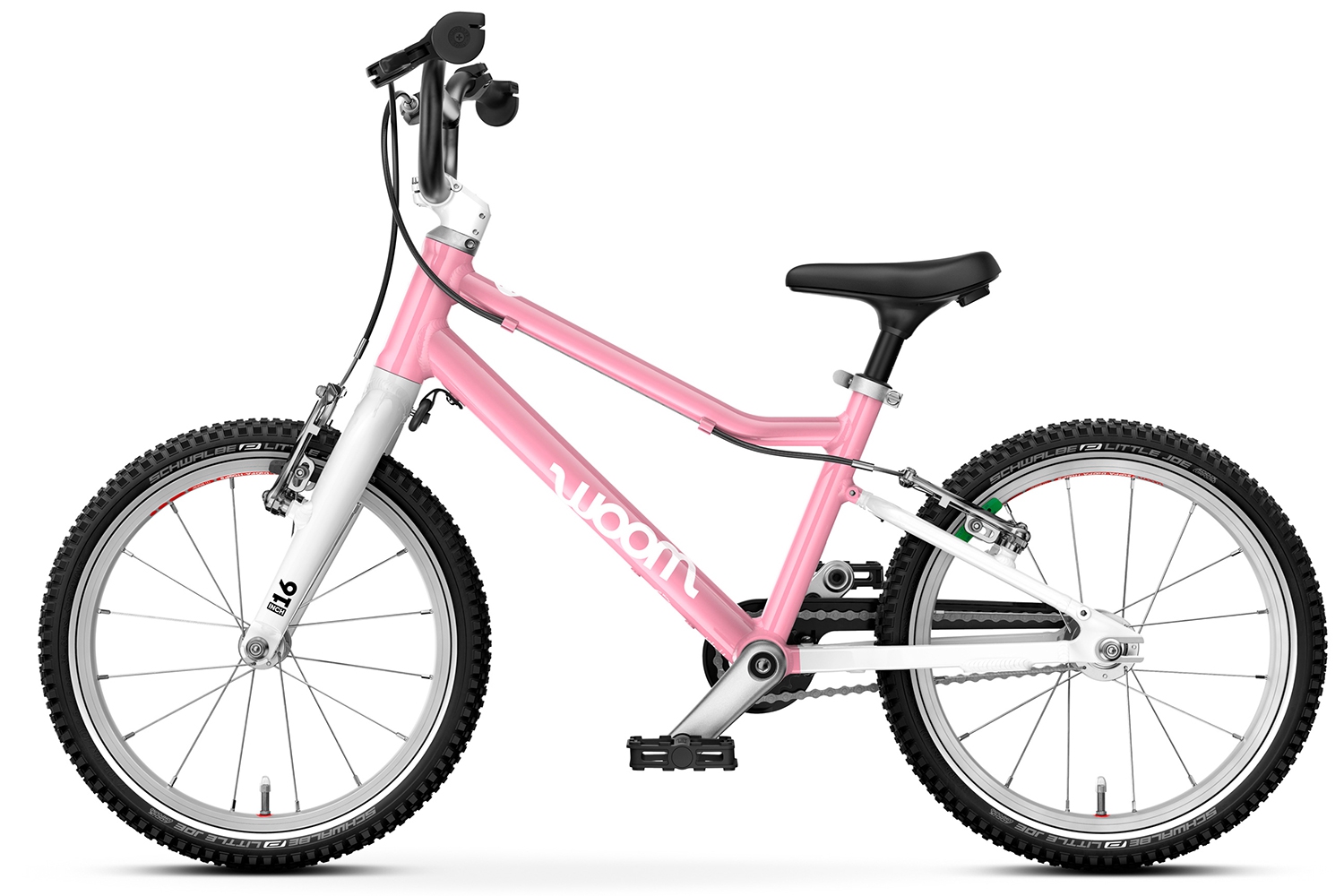 Napęd rowerka dziecięcego woom 3 GO to coraz powszechniej montowany w rowerach dziecięcych wolnobieg. Przełożenia 18 zębów z przodu oraz 10 z tyłu nie jest przypadkowe i specjalnie jest dobrane aby wspomagać naukę jazdy oraz doskonalenie tej umiejętności. Ramiona pedałów o długości 95 mm oraz rozstawie dopasowanym do dziecięcej anatomii zwiększają komfort użytkowania oraz ułatwiają naukę jazdy. Ponadto dzięki wolnobiegowi dziecko bez problemu ustawi pedałki do wygodnej pozycji startowej. Ponadto ogromną zaletą wolnobiegu jest niewątpliwie brak konsekwencji przy pomyłce pedałowania do tyłu. Szczelna zabudowa napędu zapobiega wciągnięciu lub pobrudzeniu nogawki przez łańcuch oraz zabezpiecza napęd przed zabrudzeniami. 16 calowe koła zostały wyposażone w aluminiowe obręcze oraz wysokiej klasy niemieckie opony Schwalbe o niskich oporach toczenia, co zapewnia bardzo komfortową i przyjemną jazdę. Ponadto opony posiadają odblaskowy pasek, który zwiększa bezpieczeństwo i widoczność rowerzysty po zmroku.