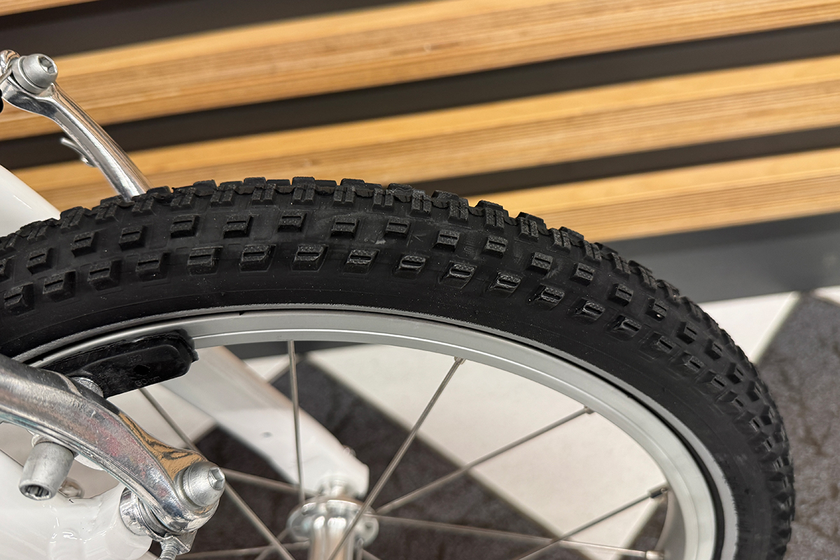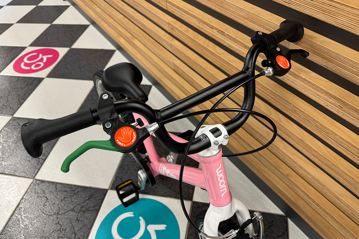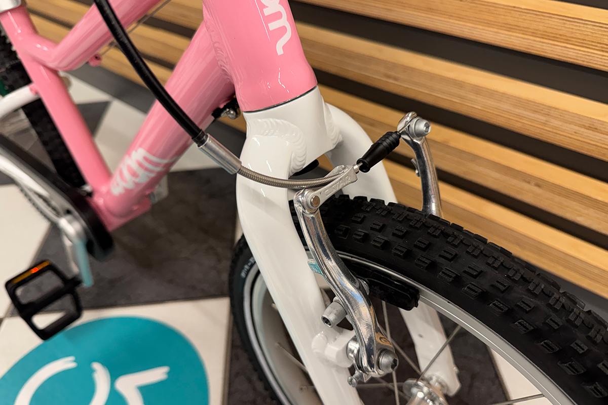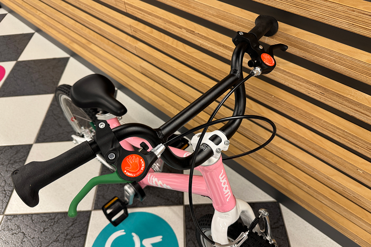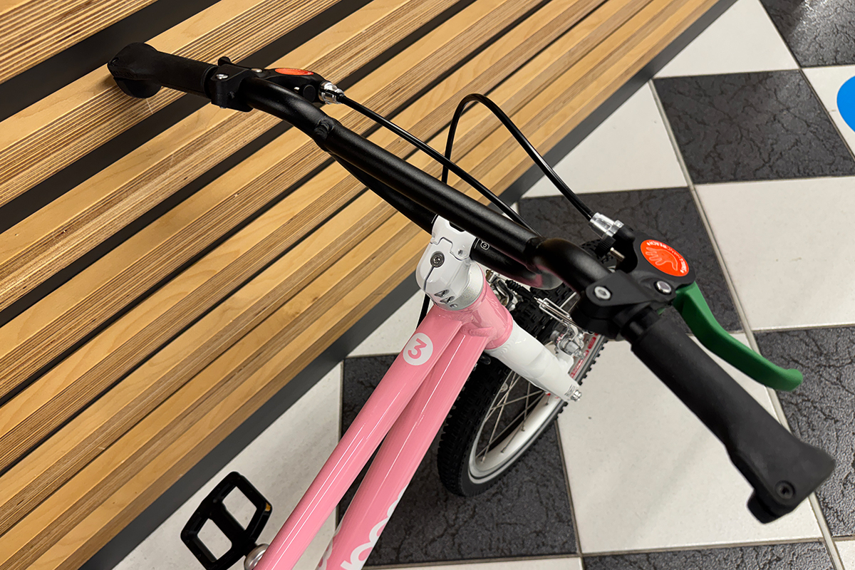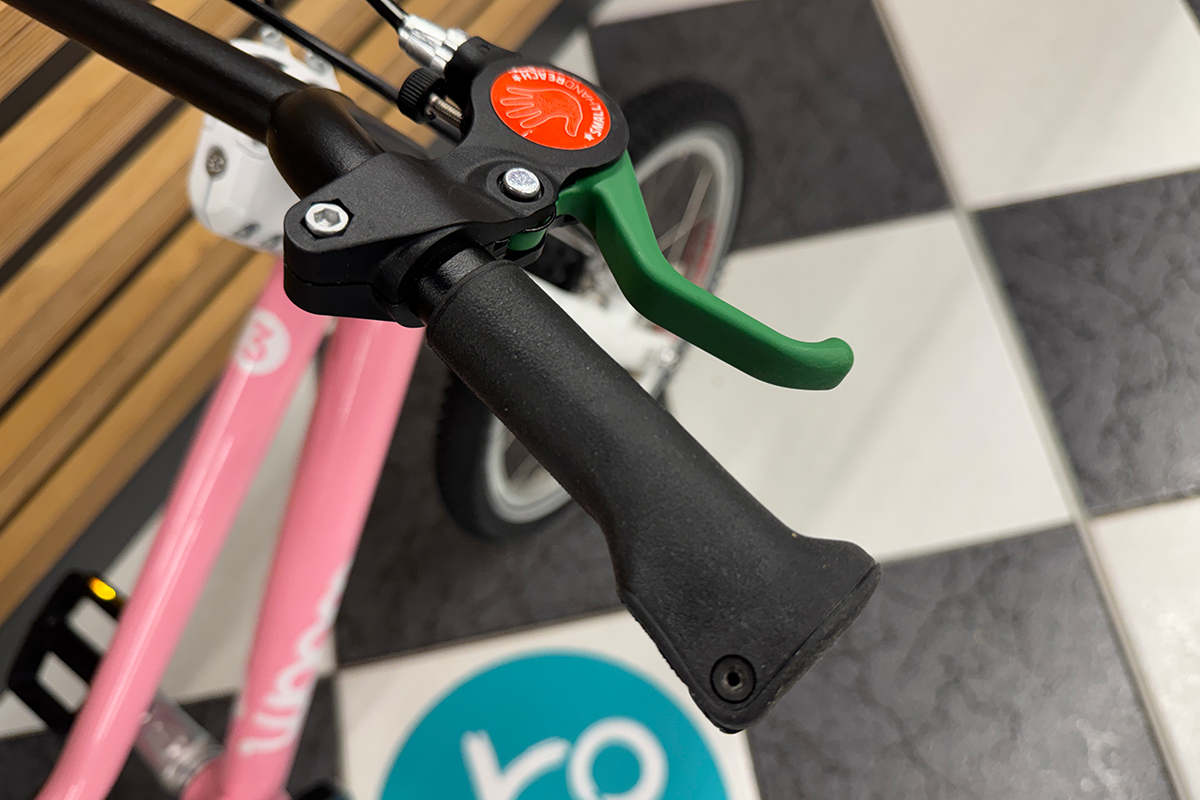 W rowerze dziecięcym woom GO 3 zastosowano tradycyjne hamulce V-Brake, które są nie tylko bardziej praktyczne niż tzw 'kontra', ale także dzieci uczą się już używać hamulców, które będą im towarzyszyć przez całe życie. Klocki hamulcowe wykończone miękką okładziną zapewniają dużą i skuteczną siłę hamowania przy niedużej sile nacisku klamki hamulca. Jeśli już mowa o klamkach hamulcowych, to woom postanowił wspomóc dzieci na początku ich przygody i oznaczyć która klamka hamulcowa odpowiada za który hamulec – zielona klamka i zielone klocki hamulcowe to tylny hamulec; czarna klamka i czarne klocki to przedni hamulec. Takie rozwiązanie jest bardzo pomocne i pomaga dziecku rozróżnić hamulce, aby zapobiec przypadkowej pomyłce. Ponadto dźwignie hamulca są specjalnie 'pomniejszone' aby dopasować się do dziecięcych rączek.