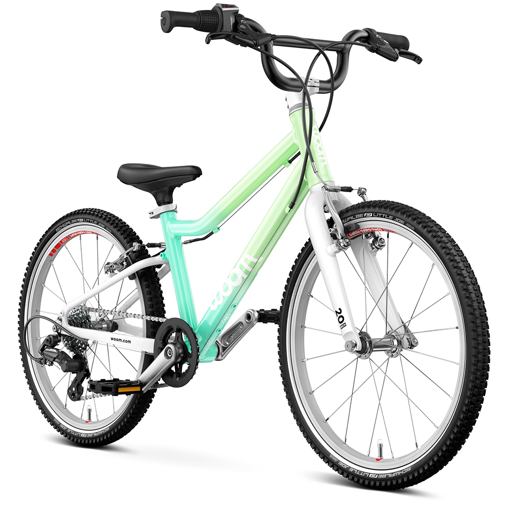20 calowe koła wykonane z aluminium są montowane na szybkozamykaczach, co pozwala na szybki montaż oraz demontaż np. w razie wymiany dętki czy opony. Piasty z uszczelnianymi łożyskami zapewniają gładką oraz płynną jazdę. Opony w rowerze woom 4 GO to produkt renomowanej niemieckiej firmy Schwalbe. Opony Schwalbe Little Joe zapewniają niskie opory toczenia a także dobrą amortyzację i przyczepność w każdym terenie. Ponadto boczny odblaskowy pasek na ogumieniu zwiększa bezpieczeństwo w przypadku jazdy po zmroku.