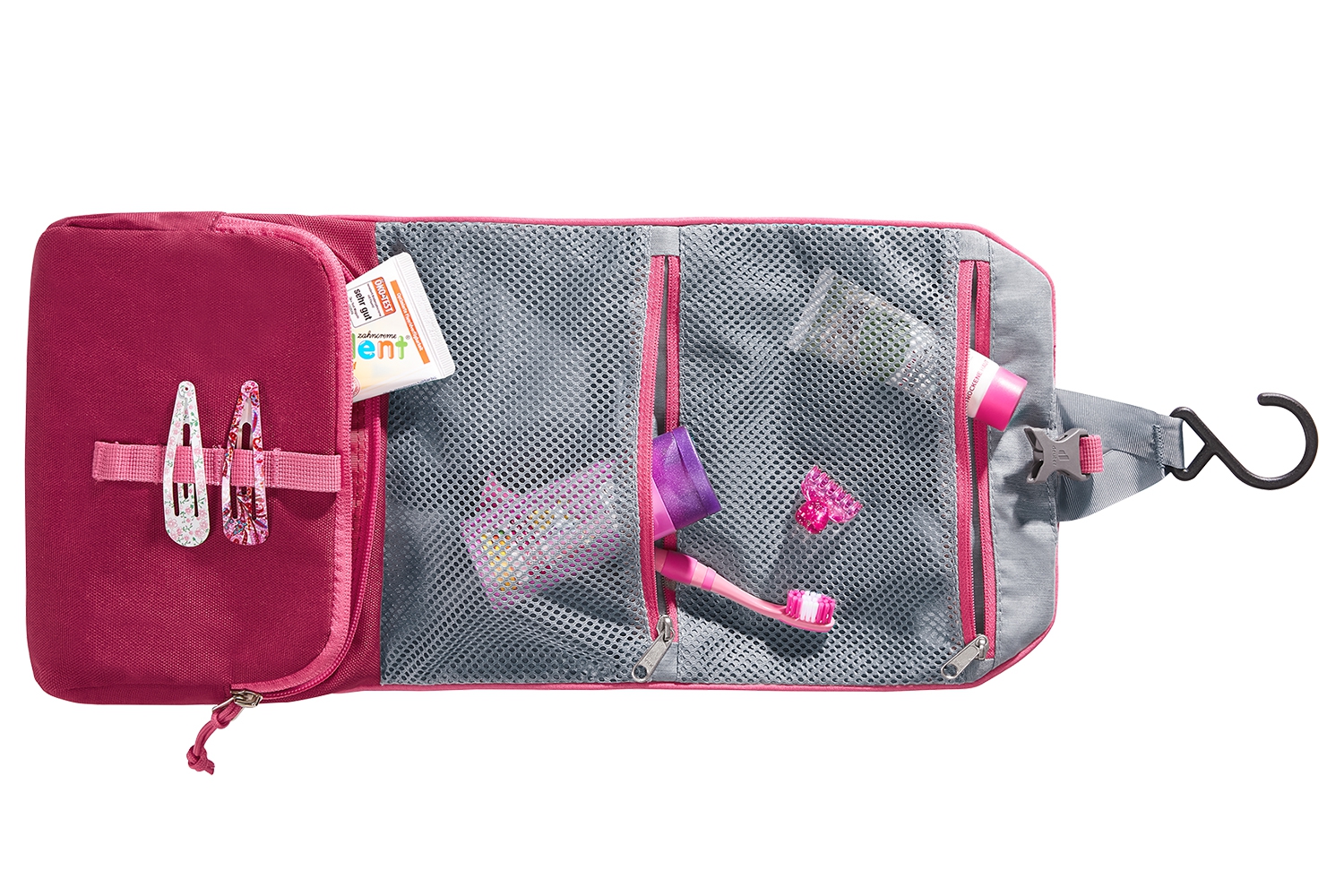 Deuter Wash Bag Kids to wygodna i pojemna kosmetyczka zaprojektowana specjalnie dla dzieci. Idealnie sprawdzi się na wakacjach, szkolnych wyjazdach czy nocowaniu u przyjaciół. Wykonana została z lekkiego, wytrzymałego i wodoodpornego materiału 600D, który powstaje z recyklingu. Dzięki temu jest nie tylko trwała, ale też przyjazna dla środowiska. Głównym elementem kosmetyczki jest pojemna komora, która wewnątrz podzielona została na dwie płaskie kieszonki z siateczki zamykane na suwak. Pozwalają one uporządkować drobne akcesoria, takie jak szczoteczka, pasta czy mydełko. Dodatkowe elastyczne pętle utrzymują wszystko na swoim miejscu, a praktyczny haczyk umożliwia zawieszenie otwartej kosmetyczki na haczyku w łazience lub w namiocie, dzięki temu dziecko ma łatwy dostęp do swoich rzeczy w każdej sytuacji. Całość zamykana jest na praktyczną klamrę, co ułatwia samodzielne korzystanie nawet najmłodszym użytkownikom. Kosmetyczka Deuter Wash Bag Kids jest wolna od szkodliwych związków PFC, co oznacza, że nie zawiera substancji chemicznych mogących szkodzić zdrowiu i naturze. Produkt posiada także certyfikat Fair Wear potwierdzający odpowiedzialną i etyczną produkcję.